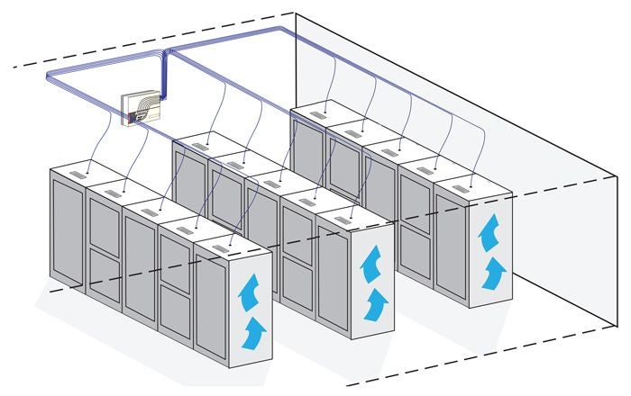 Branddetectie computerruimte. Goede branddetectie in computerruimten is afhankelijk van meerdere factoren..! De factor met de meeste invloed is de wijze waarop de ICT apparatuur in de computerruimte gekoeld wordt. Op de afbeelding is er sprake van ruimtelijk werkende koeling. Hier vindt branddetectie in de computerruimte plaats aan de hand van laser aspiratie branddetectie middels aspiratiebuizen en rookaanzuig monden per serverkast. Aspiratie laser branddetectie wordt in computerruimten steeds meer als aanvullend, ter optimalisatie van de branddetectie in computerruimten, op standaard aan het plafond gemonteerde rookmelders toegepast.